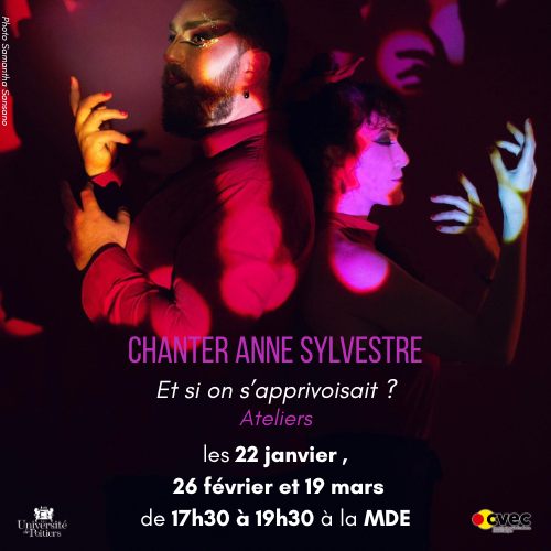 Display mapLes 5 et 6 mars 2025, Paul Paitel et Anaïg Drion joueront à la Maison des étudiant·es leur spectacle “Pour qu’on s’apprivoise” - reprise en mode cabaret queer du répertoire d’Anne Sylvestre. En préambule, iels vous proposent 3 ateliers de rencontre avec les chansons d’Anne Sylvestre les 20 novembre, 22 janvier et 26 février de 17 h 30 à 19 h 30. Des ateliers pour :