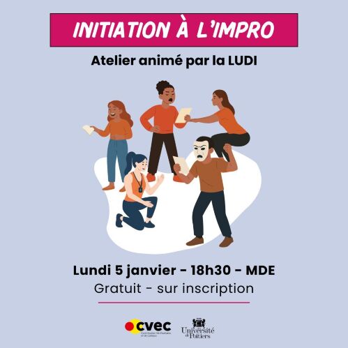 La LUDI (Ligue Universitaire d’Improvisation) te propose une initiation ludique et accessible à tous les niveaux ! Pendant cet atelier, tu apprendras à lâcher prise, développer ta créativité, travailler l’écoute et t’amuser en groupe grâce à des exercices d’improvisation dynamiques et bienveillants.