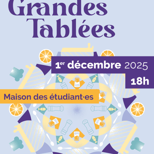 L’université de Poitiers, avec la complicité des associations du Label "Asso de l'UP" a le plaisir de vous inviter à la soirée "Les Grandes Tablées" : Les Grandes Tablées visent à mettre en lumière la richesse du tissu associatif qui agit au sein de l’établissement dans une ambiance chaleureuse, conviviale et festive ! Au programme : – Cérémonie de remise du Label « Asso de l’UP » par Virginie Laval (en cours de confirmation), présidente de l’Université de Poitiers – Ateliers, jeux et dégustations avec les associations – Raclette géante ! – Fin de soirée en musiques (DJ SET)